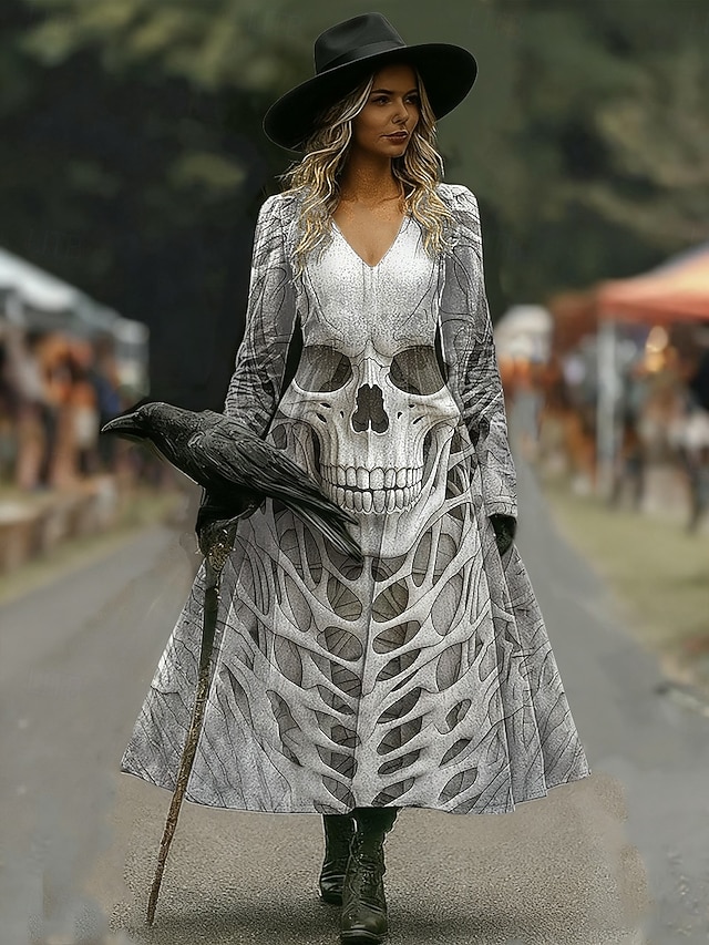 Sukienka midi z nadrukiem czaszek sukienka w kształcie litery A wakacje casual codzienna standardowa grafika czaszki długi rękaw dekolt w serek niebieski pomarańczowy szary jesień zima#19377719