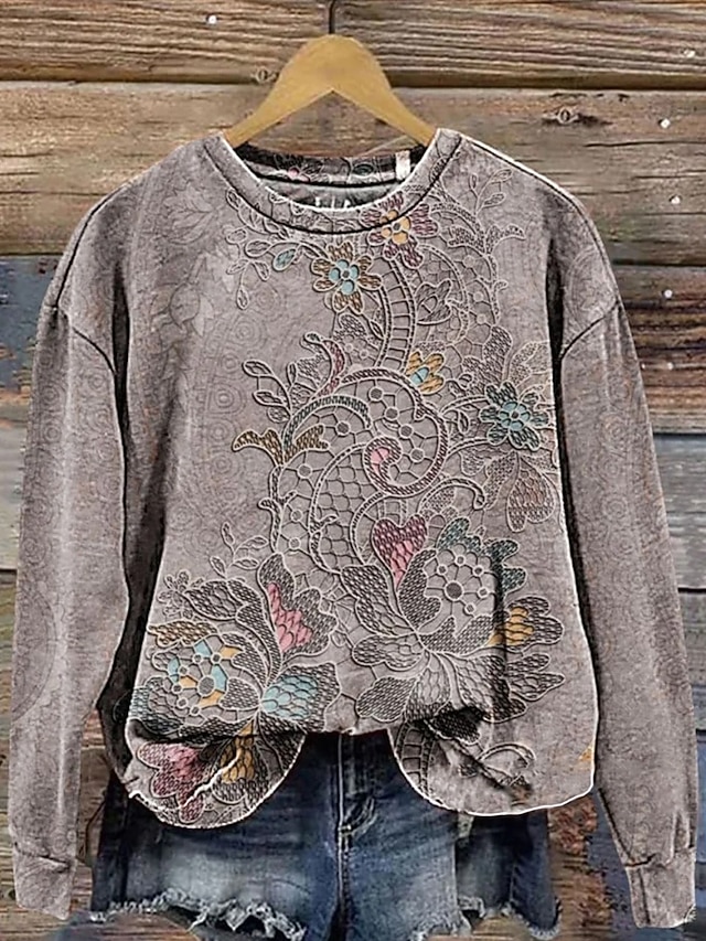 Damskie Z kapturem Nadruk Kwiaty Codzienny Długi rękaw Okrągły dekolt Zwykłe topy Codzienny Praca Na co dzień Szary Jesień Zima #19385027