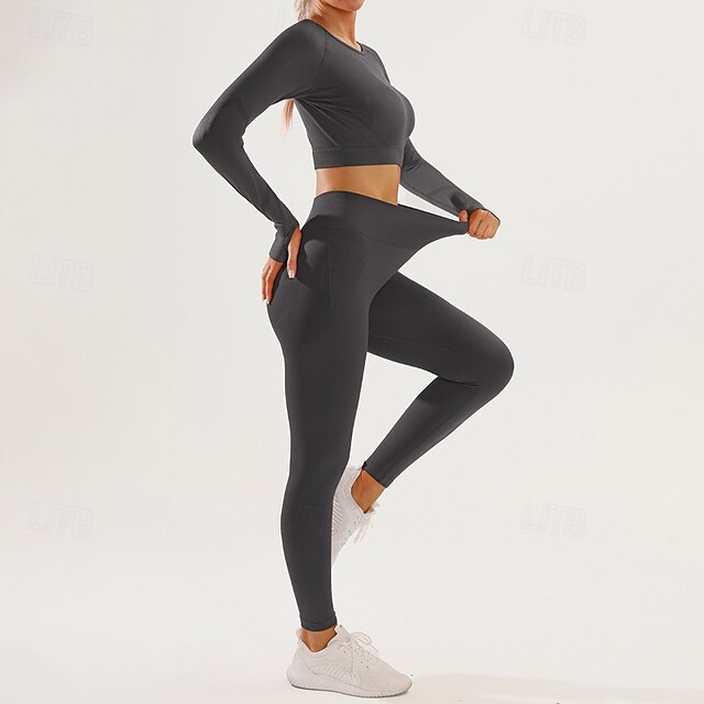 Damskie 2 elementy Dres do jogi Stroje do salonu Jednokolorowe Zestawy odzież Jesień Czarny Czerwony Trening w siłowni Wysoka talia Elastyczny Oddychający Długi rękaw Sport Odzież sportowa Szczupła#19719738