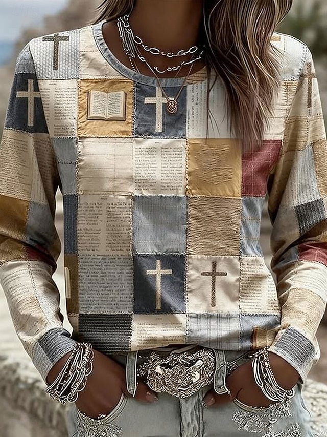 Damskie Podkoszulek Nadruk Graficzny Geometryczny Zabytkowe Moda Elegancki Długi rękaw Półgolf Okrągły dekolt Zwykłe topy Codzienny Weekend Beżowy Jesień Zima #9808380