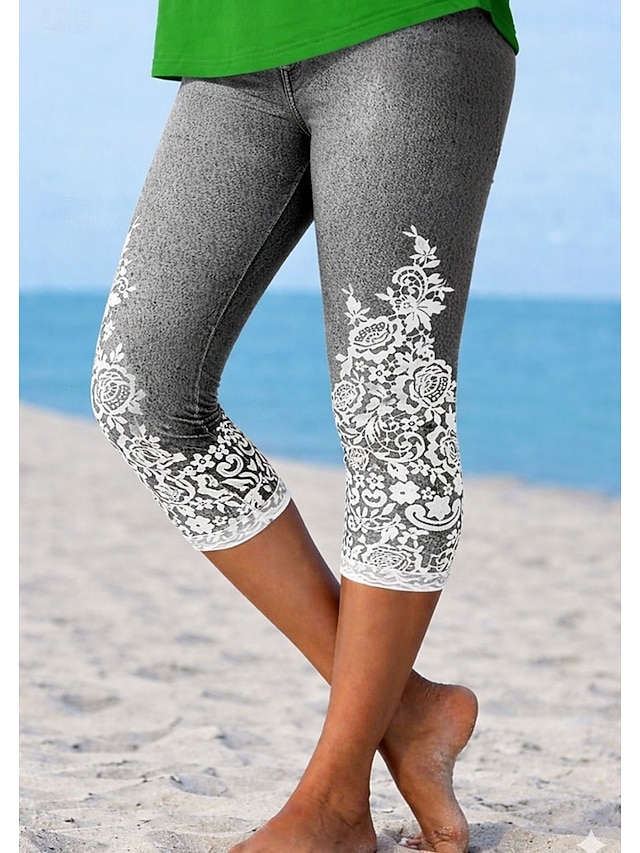 Damskie Getry Urlop Moda Hawajskie Capris Średni Talia Kwiaty Graficzny Drukowanie Nadruk Komfort Miękka Oddychający Wysoka elastyczność Codzienny Urlop Formalny Niebieski popielaty Lato Wiosna #9863350