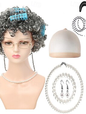 Peruka starszej pani z wałkami do włosów, perłowy naszyjnik, kolczyki, zestaw laski dla kobiet i dziewcząt, babcia, cosplay, kostium z filmu „100 dni szkoły”, dodatek na imprezę halloweenową