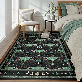 Dywanik z motywem ćmy księżycowej i kwiatów, z liśćmi i księżycem, symetrycznym wzorem botanicznym, trwały i dekoracyjny do sypialni lub salonu, wykonany metodą rysowania epizodycznego