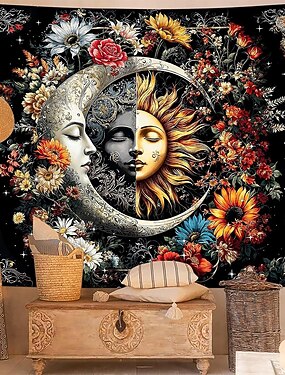 Gobelin ze słońcem i księżycem, niebiańskie kwiaty, słoneczniki, róże, styl boho hipisowski, dekoracja ścienna do sypialni, salonu, sali do jogi i medytacji