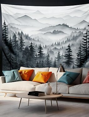 Gobelin ścienny z górskim lasem, mglista sosna, tuszowany krajobraz, wiszący na ścianie, minimalistyczny, szary, czarno-biały, sztuka natury do salonu, biura, sypialni, wystrój domu w stylu zen