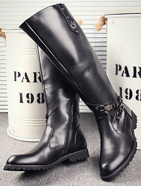 czarne, męskie oficerki za kolano – wysokie, dopasowane, w stylu jeździeckim, z bocznym zamkiem błyskawicznym, idealne na oficjalne okazje, gotyckie cosplaye i imprezy kostiumowe