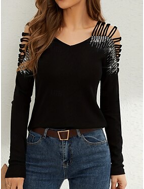 Damskie Bluzka Niejednolita całość Oczko Jednokolorowe Elegancki Codzienny Długi rękaw W serek Zwykłe topy Codzienny Czarny Biały Czerwony Zielony Wiosna Jesień Zima