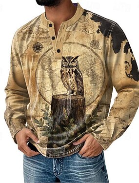 Męskie Graficzny Sowa Koszula Henley Długi rękaw Moda Śłodkie Codzienny Codzienny Święto Wyjściowe Jesień i zima Wiosna Niebieski Fioletowy Khaki Szary Henley Koszulka Henley