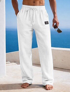 Męskie Lniane spodnie Spodnie Letnie spodnie Spodnie plażowe Elastyczny pas Ściągana na sznurek Prosta noga Naszywka Komfort Oddychający Pełna długość Codzienny Święto Urlop Moda Czarny Biały