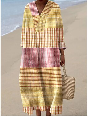 Damskie Sukienka maxi Codzienne sukienki Zabytkowe Codzienny Na zewnątrz Plaża Luźna Geometryczny Krótki rękaw Półgolf Żółty Rumiany róż Pomarańczowy Khaki Lato Wiosna