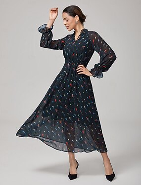 damska długa sukienka z czarnego szyfonu z nadrukiem papugi, falbaniasty kołnierzyk, elegancka, formalna, na wesele, wiosna lato jesień