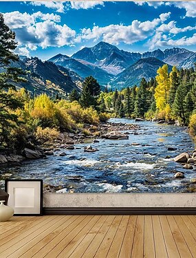 gobelin krajobraz górski, rzeka, sosny, jesienny las, krajobraz, duża tkanina, sztuka, wystrój domu, tło, plakat z tkaniny