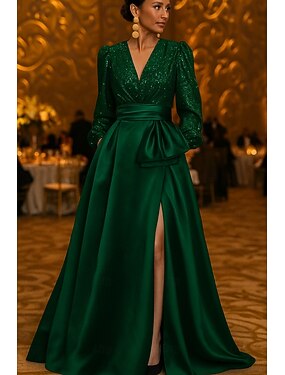 Krój A Sięgająca podłoża Suknia wieczorowa Suknia balowa Suknia formalna Elegancja Błyszczące Wysoki split Długi rękaw W serek Ślub Formalny Kieszonki Satyna Z cekinami z Brokat Plisy Kieszeń