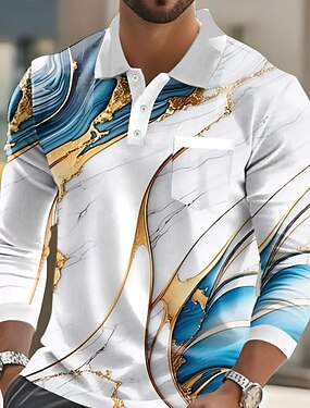 Męskie Geometryczny Tenké Gra polo Długi rękaw Koszulki polo Koszule z kołnierzykiem Biznesowy swobodny Biznes Athleisure Dzienne zużycie Kieszeń Druk 3D Guziki Wiosna Jesień Zima Niebieski Złoty