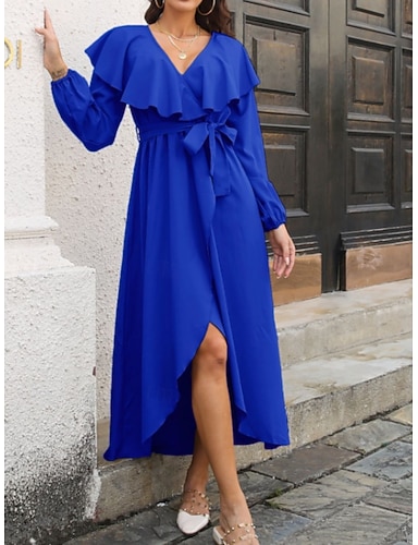 Damskie Sukienka midi Sukienka kopertowa Sukienka A line Codzienny Codzienny Regularny Równina Długi rękaw W serek Niebieski Czarny Brązowy Zielony Lato Wiosna Jesień