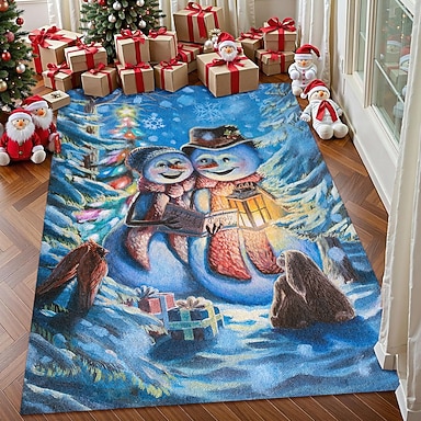 Świąteczny dywanik z parą bałwanków do salonu i sypialni dywan z faux kaszmirem w zimowym lesie miękki dywanik antypoślizgowy do prania w pralce śpiewające bałwanki autorstwa Dakota Daetwiler