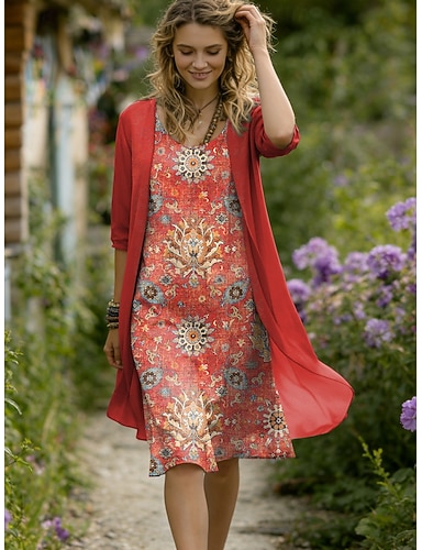 Damskie Sukienka midi Sukienka Boho Codzienne sukienki Sukienka A line Sukienka z nadrukiem Zabytkowe Na zewnątrz Urlop Weekend Regularny Kwiaty Graficzny Abstrakcja Krótki rękaw W serek Czerwony