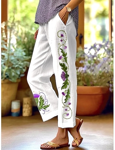 Kobiece lniane chinosy proste wakacyjne styl vintage etniczny długość do kostek wysoki stan kwiatowa grafika haftowana kieszeń drukująca miękka na świeżym powietrzu oddychająca nieelastyczna casual