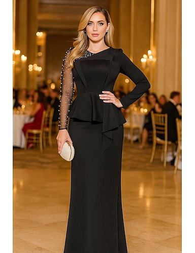 Ołówkowa Kolumnowa Sięgająca podłoża Suknie balowe Suknia wieczorowa Suknia balowa Suknia formalna Elegancja Błyszczące Fason celebrycki Długi rękaw Wysoki Impreza w ogrodzie Ślub Rozciągliwa krepa z