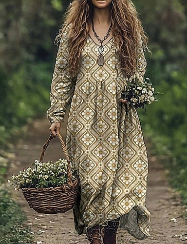 Damskie Sukienka maxi Zabytkowa sukienka Codzienne sukienki Zabytkowe Codzienny Na zewnątrz Urlop Luźna Geometryczny Groszki Długi rękaw W serek Żółty Wiosna Jesień