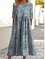 Damska sukienka midi Boho w kształcie litery A wakacyjna casualowa regularne dopasowanie floralna grafika 3/4 rękaw dekolt w serek niebieski khaki wiosna jesień