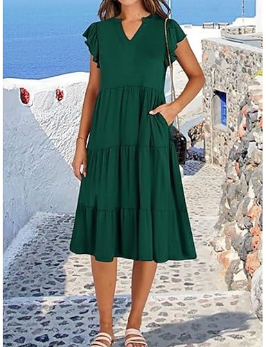 Damskie Sukienka midi Codzienne sukienki Sukienka A line Elegancki Podstawowy Codzienny Codzienny Urlop Regularny Równina Krótki rękaw W serek Czerwony Zielony Lato Wiosna