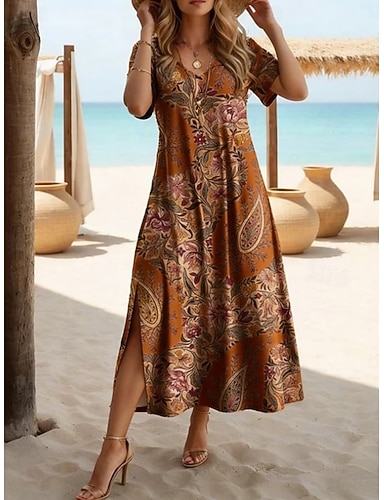 Damskie Sukienka maxi Sukienka letnia Sukienka t-shirtowa Sukienka A line Urlop Codzienny Plaża Wyjściowe Regularny Kwiaty Graficzny Krótki rękaw W serek Niebieski Fioletowy Pomarańczowy Lato Wiosna