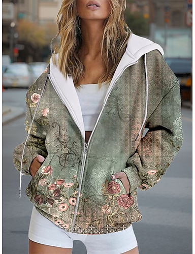 Damskie Bluzy rozpinane Zamek Kieszeń Nadruk Kwiaty Graficzny Moda Codzienny Długi rękaw Kaptur Zwykłe topy Ulica Na co dzień Niebieski Fioletowy Zielony Wiosna Jesień