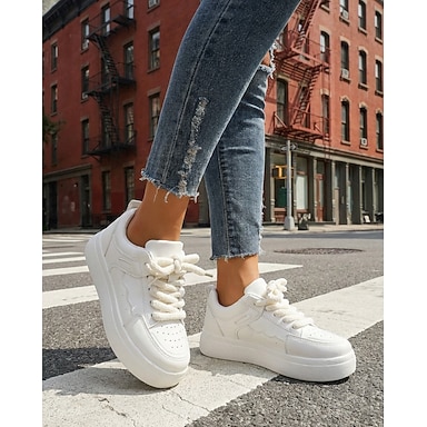 Damskie białe trampki na platformie - wygodne, grube buty wizytowe z grubymi sznurowadłami, idealne na co dzień, do miasta i na ulicę &swobodny spacer po mieście