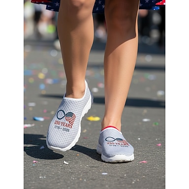 Damskie białe, patriotyczne, wsuwane trampki – lekkie, oddychające buty do chodzenia z nadrukiem amerykańskiej flagi i grafiką 250 lat, idealne na co dzień, na świąteczne okazje, w podróż i na zajęcia