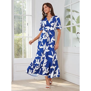 Damskie Elegancka sukienka Sukienka maxi Królewski błękit Krótki rękaw Kwiatowy wzór Kontrastowy kolor Bufka Wiosna i lato Na jedno ramię Elegancja Randka S M L