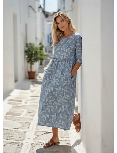 Midi sukienka lniana sukienka wakacyjna sukienka typu shift w kształcie litery A wakacyjna casualowa boho na plażę na imprezę na wyjście luźna kwiatowa graficzna bez rękawów okrągły dekolt jasny