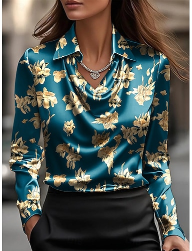 Damskie Koszula Elegancki Top satynowy Warstwa jedwabiu Nadruk W fałdki Kwiaty Elegancja Elegancki Podstawowy Długi rękaw Lejący się dekolt Zwykłe topy Codzienny Praca Święto Złoty Wiosna Jesień