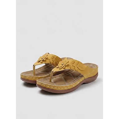 żółte, wytłoczone kwiatowe sandały na koturnie damskie – wygodne, wsuwane sandały na japonki na co dzień, latem i na plażę