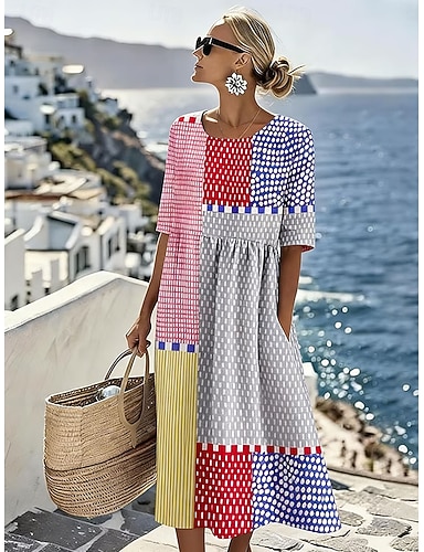 Sukienka midi damska Boho Podobna do lnu Oddychająca Lekka Sukienka przesuwna Wakacyjna Casual Codzienna Urlop Data Luźny krój Grafik Geometryczny 3/4 Długość rękawa Dekolt okrągły Niebieski Żółty