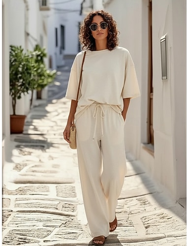 Komplet damskich spodni z lnu 15%, komplety lniane, podstawowy czysty kolor, kieszeń, elastyczny pas, T-shirt, spodnie, codzienne, uliczne, długi rękaw, okrągły dekolt, niebieski, czarny, biały, granatowy, jasnobrązowy, letni, wiosenny