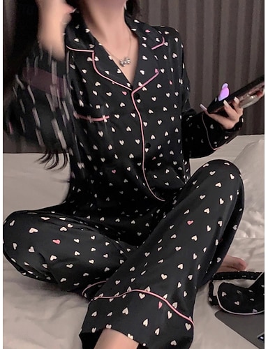 Damskie Zestawy piżamowe Codzienny Wygoda Serce Graficzny Panterka Elastyczny pas Nogawka Codzienny Dom Długi rękaw Klapa Niebieski Czarny Rumiany róż Fuksja Tęczowy Lato Wiosna Luźna