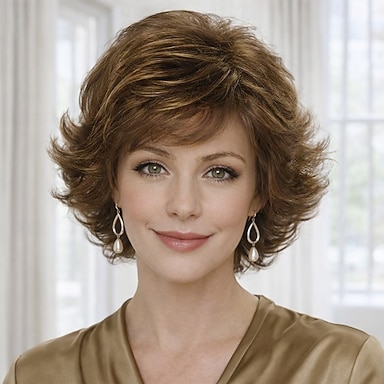 Elegancka krótka kręcona peruka dla kobiet - miękkie brązowe warstwy z dużą objętością