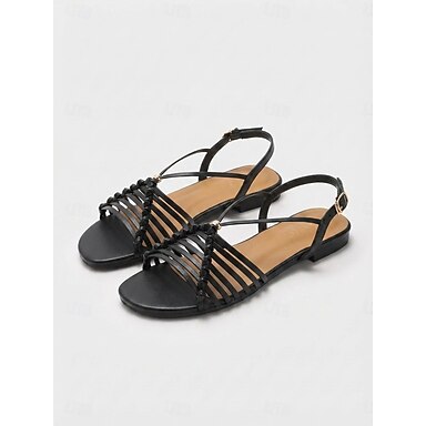 Damskie czarne sandały gladiatorki na paskach - minimalistyczne płaskie sandały boho z plecionym splotem na wakacje w kurorcie, zwiedzanie wysp &letnie podróże