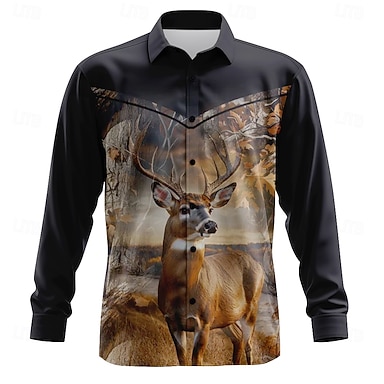 Męskie Renifer Rośliny Las Koszula Zapinana na guziki koszula Długi rękaw Vintage Retro Na zewnątrz Kemping i wycieczki Łowiectwo Wiosna Jesień Wieczorne Druk 3D koszule z kołnierzykiem Brązowy