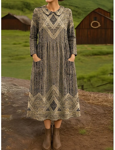 Damskie Sukienka midi Sukienka z nadrukiem Zabytkowe Moda Nowoczesny Codzienny Święto Wyjściowe Regularny Geometryczny Długi rękaw Półgolf Wino Brązowy Ciemnoszary Szary Wiosna Jesień Zima