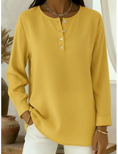 Damskie Koszule bawełniane lniane Sztuczna bawełna len Jednokolorowe Codzienny Nowoczesny Długi rękaw Półgolf Zwykłe topy Codzienny Święto Niebieski Żółty Rumiany róż Zielony Lato