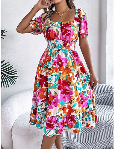Damskie Sukienka midi Sukienka A line Urlop Codzienny Na zewnątrz Wyjściowe Regularny Kwiaty Graficzny Krótki rękaw Kwadratowy dekolt Niebieski Czerwony Zielony Lato Wiosna