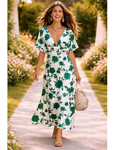 Damskie Sukienka midi Codzienne sukienki Sukienka rozkloszowana Sukienka A line Elegancki Codzienny Urlop Codzienny Regularny Kwiaty Krótki rękaw W serek Czarny Biały Fioletowy Zielony Lato