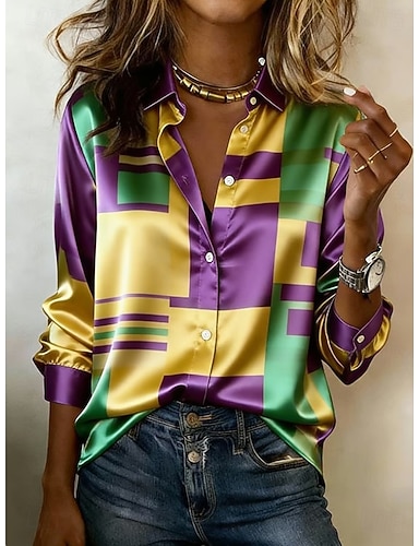 Mardi gras Damskie Koszula Graficzny Geometryczny Abstrakcja Zabytkowe Elegancki Nowoczesny Długi rękaw Kołnierzyk koszuli Długie topy Codzienny Święto Biały Żółty Jasnofioletowy Fioletowy Zielony