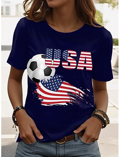Koszulka piłkarska damska z nadrukiem graficznym, napisem, stylowa, klasyczna, swobodna, krótki rękaw, okrągły dekolt, regularna, codzienna, niebieska, czarna, czerwona, zielona, letnia, wiosenna
