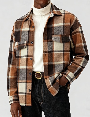Męskie Koszula kurtka Zwykła kurtka Urlop Codzienny Keep Warm Kieszeń Przycisk w dół Wiosna Jesień Jesień i zima Kratka Zabytkowe Moda Kołnierz Krótkie Ciemnoszary Żółty Rumiany róż Pomarańczowy