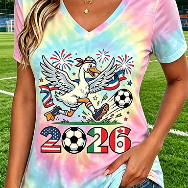 Koszulka piłkarska damska z nadrukiem graficznym, napisem, stylowa, klasyczna, swobodna, krótki rękaw, okrągły dekolt, regularna, codzienna, niebieska, czarna, czerwona, zielona, letnia, wiosenna