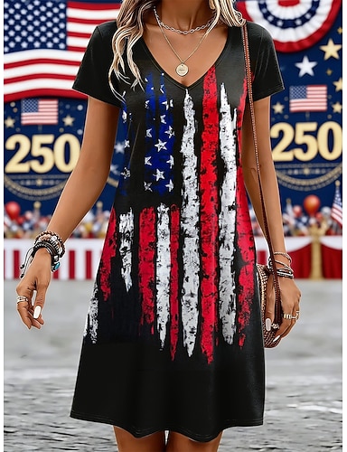 Amerykański Dzień Niepodległości Damskie Sukienka mini Sukienka t-shirtowa Sukienka A line Codzienny Codzienny Regularny Graficzny Flaga Ameryki Krótki rękaw W serek Niebieski Czarny Czerwony Lato
