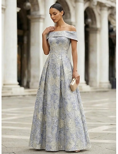 Krój A Sięgająca podłoża Suknia wieczorowa Elegancja Zabytkowe Kwiaty Krótki rękaw Z odsłoniętymi ramionami Impreza w ogrodzie Ślub Kieszonki Żakard Lejący dekolt na plecach z Kwiaty 3D